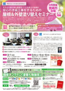 3月1日(水)、3月4日(土)、3月5日(日)、3月6日(月)に『屋根・外壁塗り替えセミナー』を行います。