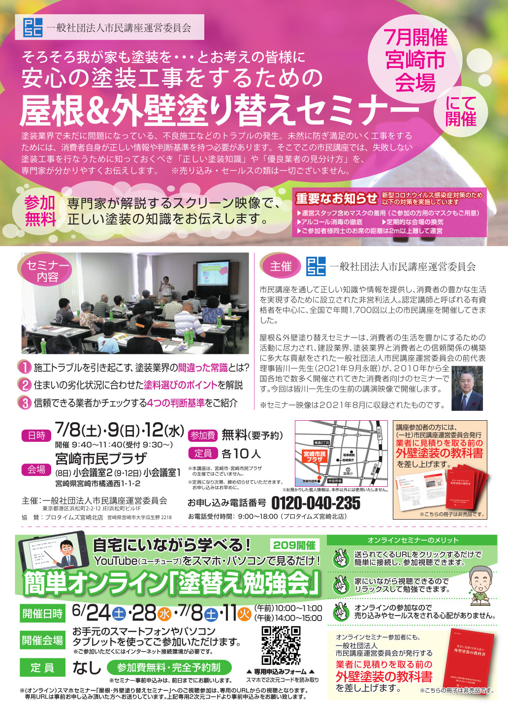 7月8日(土)、7月9日(日)、7月12日(水)に『屋根・外壁塗り替えセミナー』を行います。