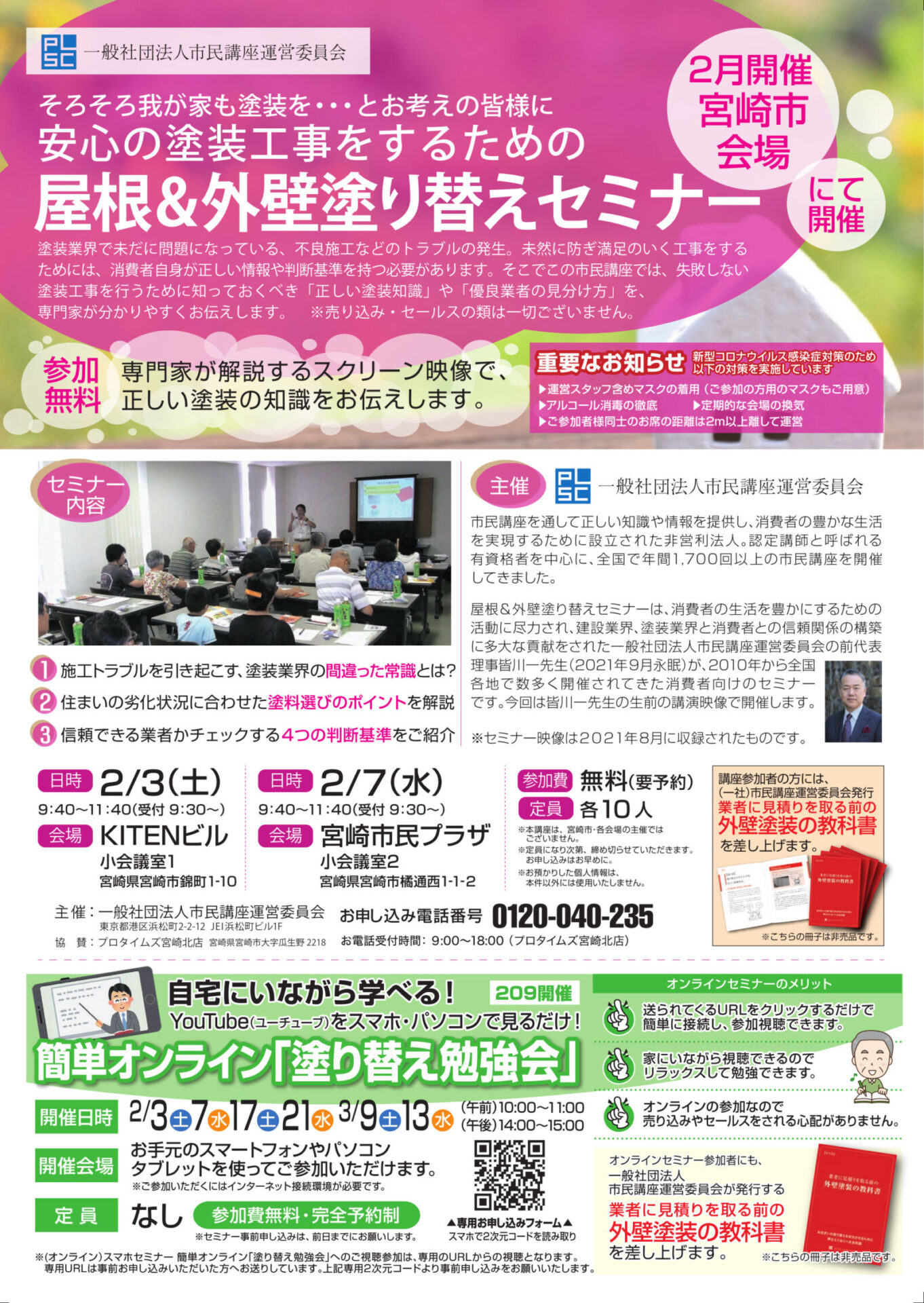 2月3日(土)、2月7日(水)に『屋根・外壁塗り替えセミナー』を行います。