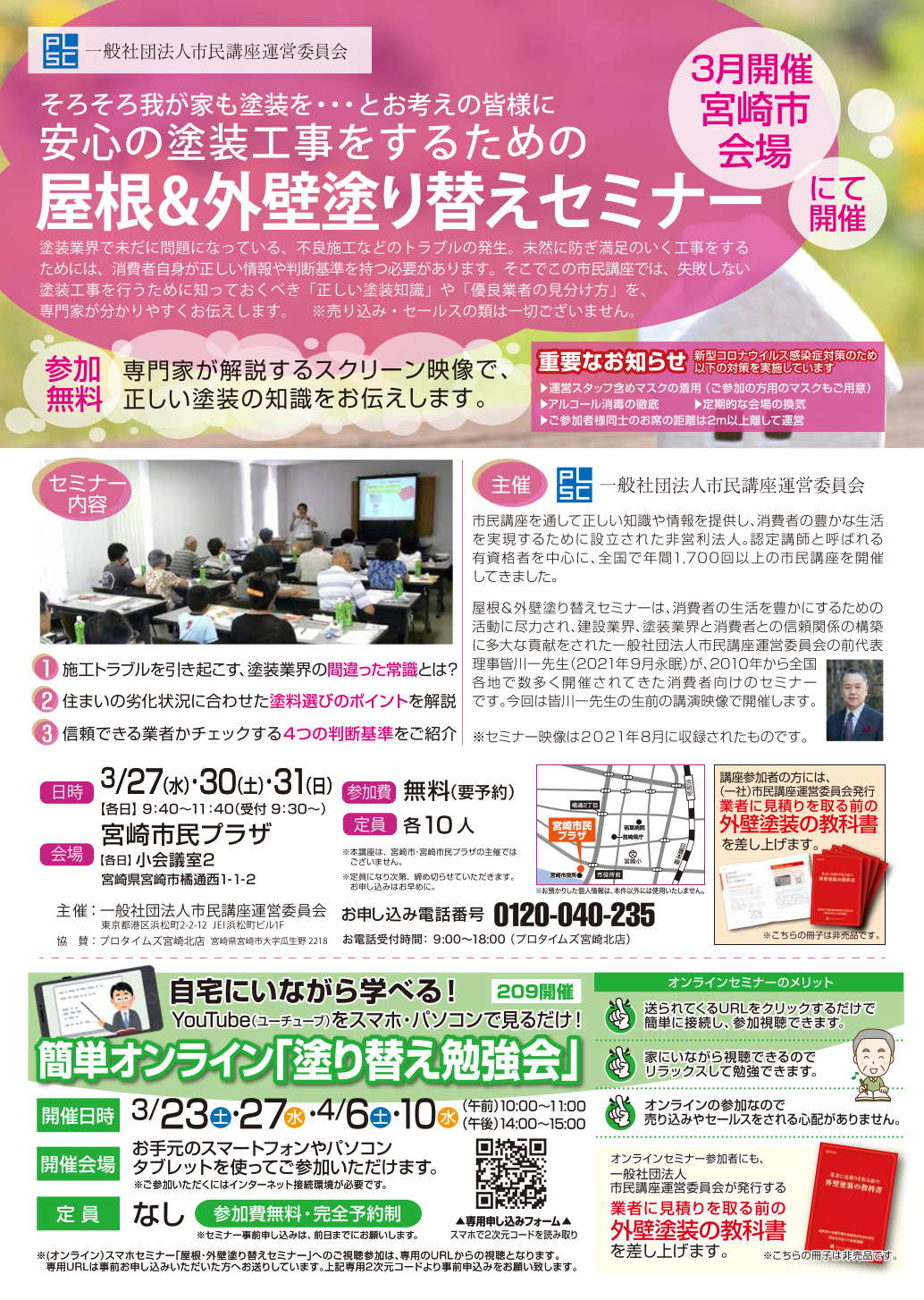 3月27日(水)、3月30日(土)、3月31日(日)に『屋根・外壁塗り替えセミナー』を行います。