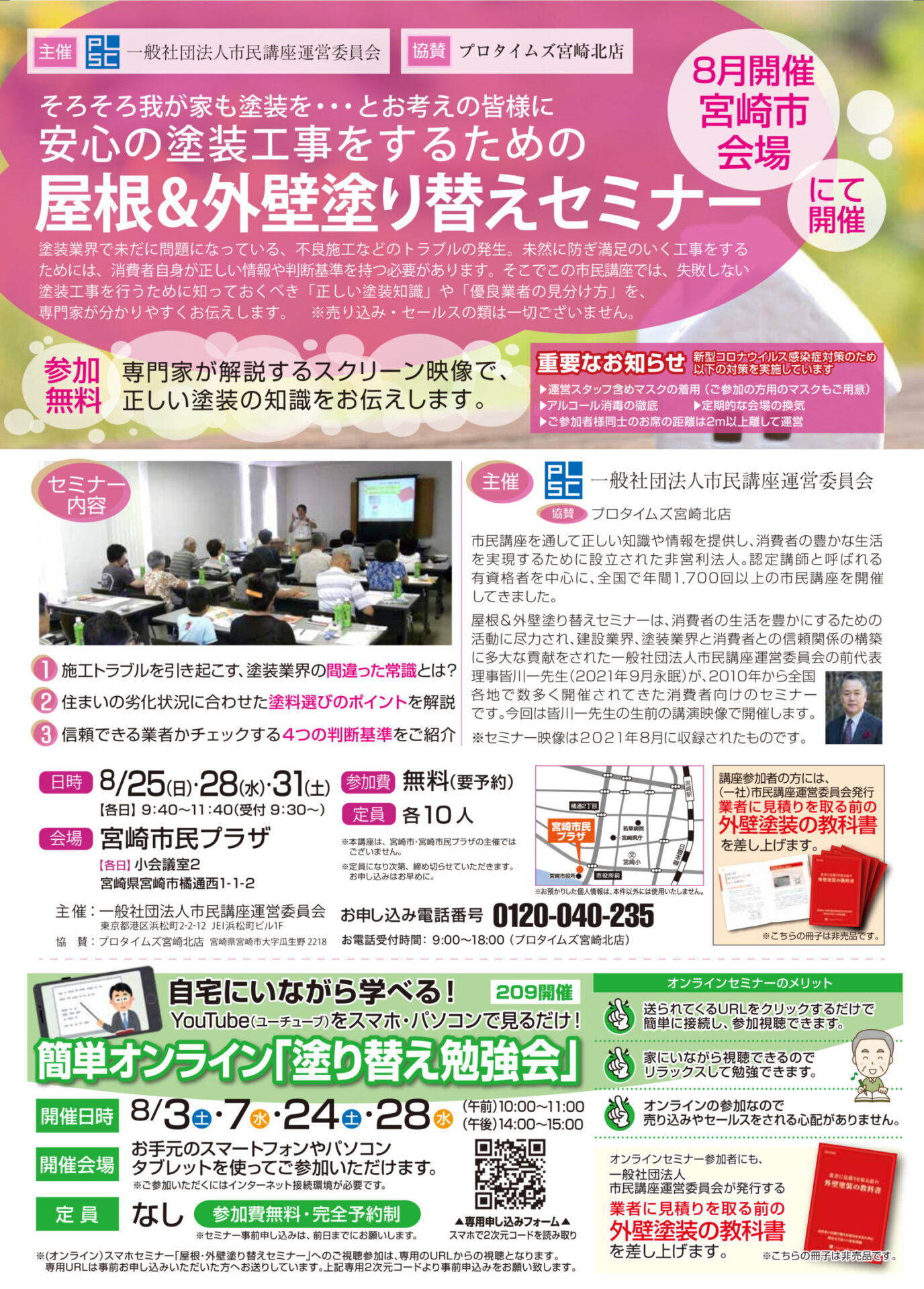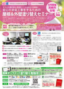 8月25日(日)、8月28日(水)、8月31日(土)に『屋根・外壁塗り替えセミナー』を行います。