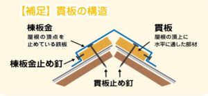 釘が抜けたり浮いてしまった結果、強風により板金が外れたり、釘穴からの水の浸入で貫板が腐食する危険性があります。