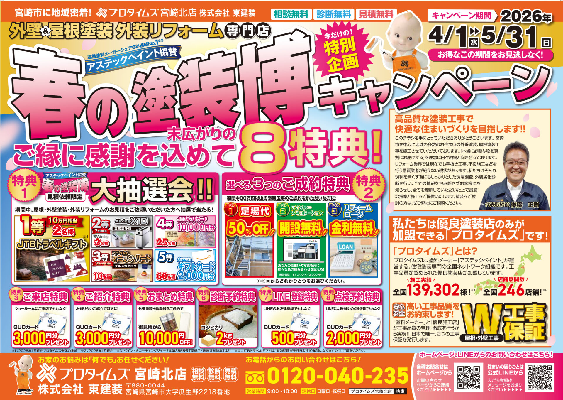 宮崎市で”そろそろ塗り替えしようかな?”と考えられている方にお得な情報!! 春の塗装博キャンペーン、お得な8特典!をご紹介します。