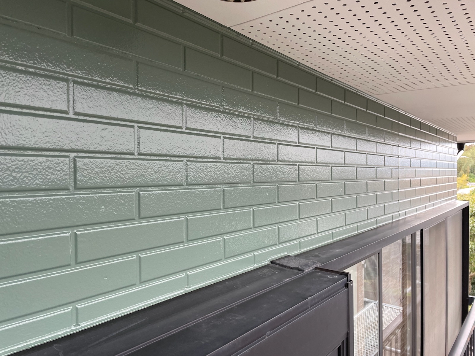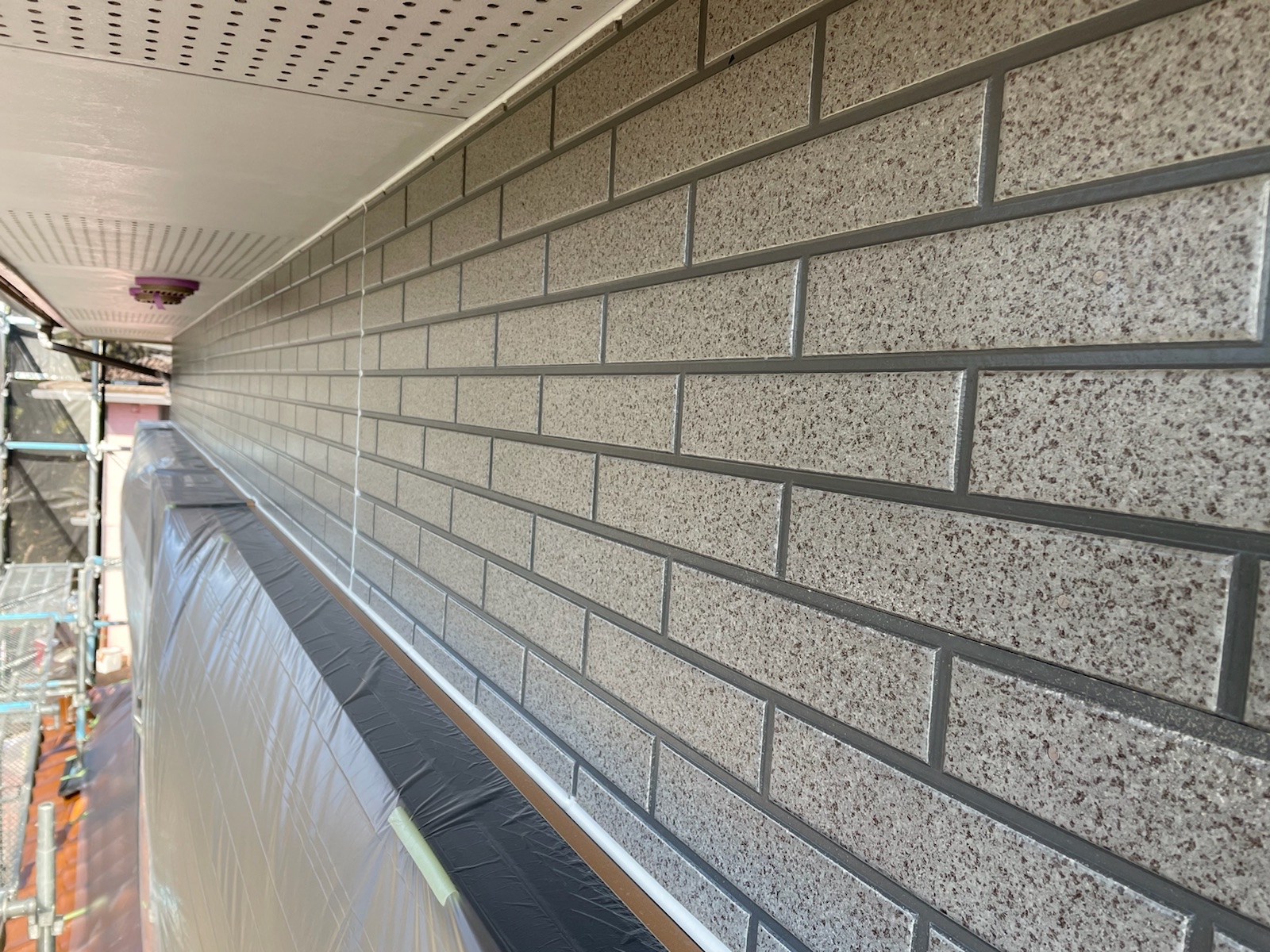 1枚目は下塗材を塗装後になります、2枚目は塗装完了後です。 1枚目に見られる白い線はシーリングの打替え修繕施工です。塗装後には覆われ隠れる部分ですが実際は写真のように綺麗に打替え出来ています。