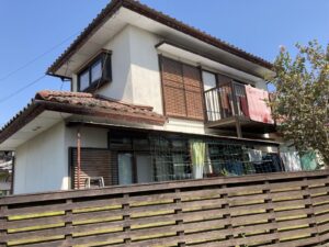 T様邸、屋根材はセメント瓦、外壁材は窯業系サイディングの2階建てのお宅になります。写真は施工前、足場仮設後になります。