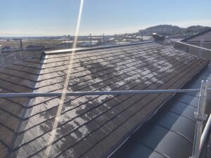 K様邸、屋根材はスレート瓦、外壁材は窯業系サイディングの2階建てのお宅になります。写真は施工前、足場仮設後(屋根)になります。