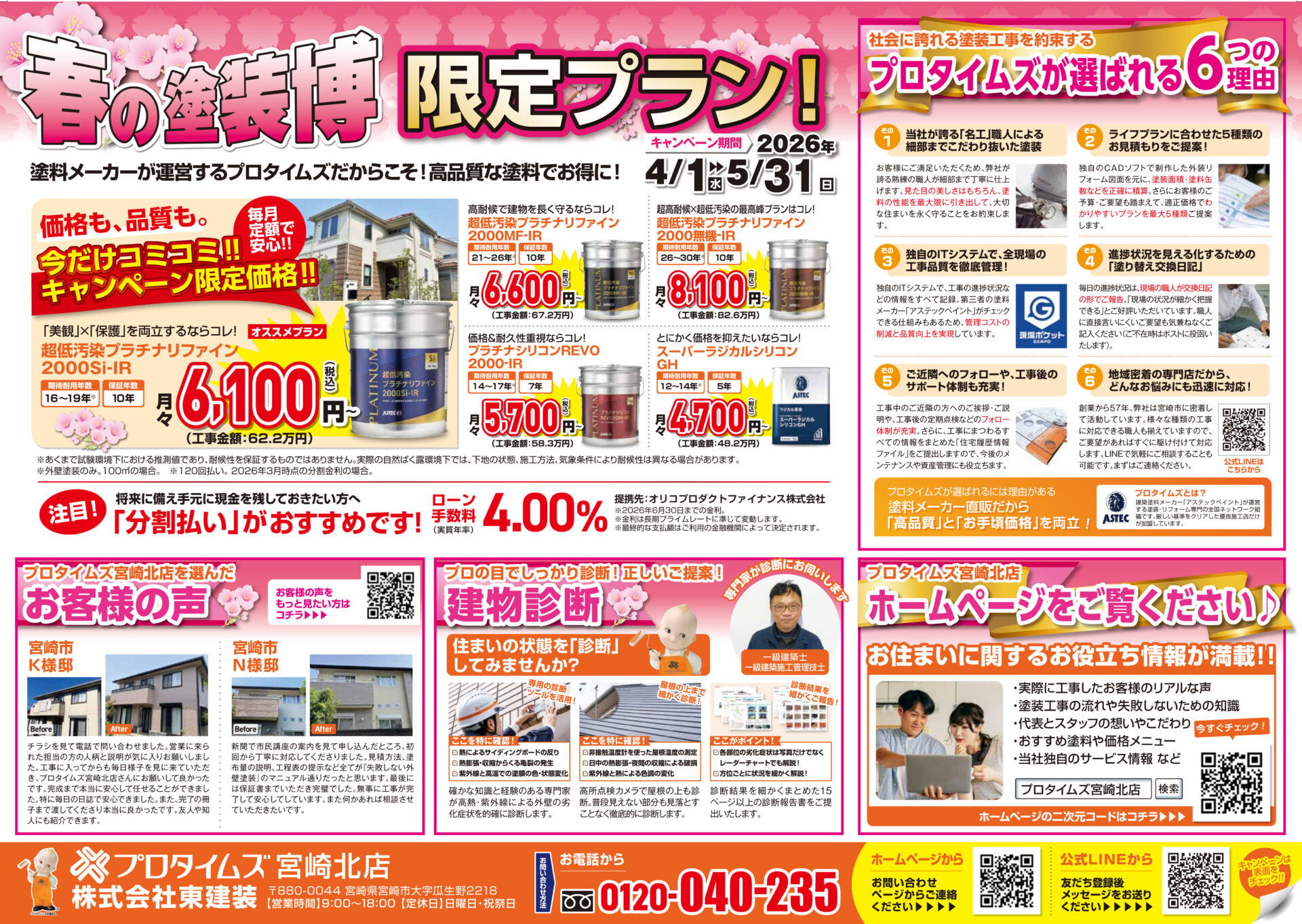 HOMEキャンペーン春の塗装博キャンペーンを開催いたします! 春の塗装博キャンペーンを開催いたします! 春の塗装博キャンペーンを開催いたします! 投稿日:2026.04.01 春の塗装博キャンペーン実施決定! 2026年4月1日 から 5月31日 までの期間限定で、ご縁に感謝を込めて豪華8大特典をご用意! 10万円相当の旅行券や空気清浄機などの豪華特典が、抽選で100名様に当たります♪ 外壁・屋根塗装をするなら、お得な今がチャンスです! お得なキャンペーン特典、詳しくはこちら↓ 春の塗装博キャンペーン 開催します!! お得に外壁塗装が出来るチャンス!この機会にぜひご自宅の塗装をご検討を宜しくお願い致します。 Japan お申し込みフォーム お名前 必須 例:塗装 太郎 住所 必須 例:000-0000 例:〇〇県〇〇市〇〇0丁目00-00 例:〇〇マンション000 ※空欄可 電話番号 例:09000000000 メールアドレス 必須 例:xxx@xxx.com お問い合わせ内容 ※ご自由にお書き下さい このサイトはreCAPTCHAによって保護されており、Google プライバシーポリシーと利用規約が適用されます。 ピックアップPICKUP リフォームローン 施工品質の裏付け 屋根カバー工法 外壁塗装の塗り替えサイン 火災保険でお得に修繕 住宅履歴情報管理システム 塗装品質へのこだわり 有資格者による建物診断 わかりやすく納得の見積もり 職人紹介 塗装の匠