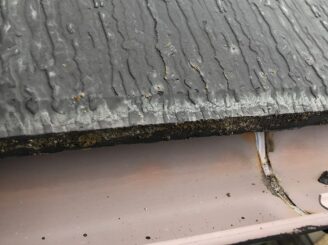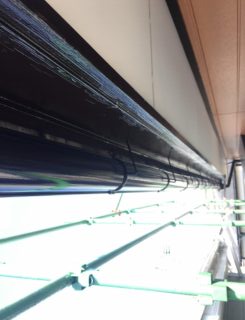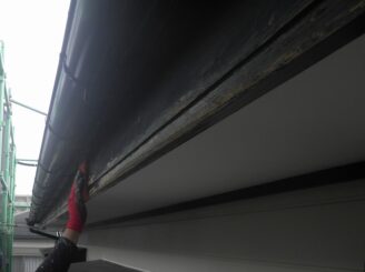 軒先です。小口の塗膜は剥がれ、セメント成分が露出しています。