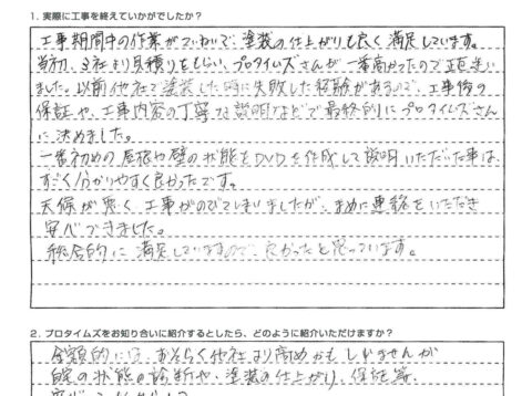 工事期間中の作業がていねいで塗装の仕上がりも良く満足しています。当初、3社より見積りをもらい、プロタイムズさんが一番高かったので正直まよいました。以前他社で塗装した時に失敗した経験があるので、工事後の保証や、工事内容の丁寧な説明などで最終的にプロタイムズさんに決めました。一番初めの屋根や壁の状態をDVDを作成して説明いただいた事は、すごく分かりやすく良かったです。天候が悪く工事がのびてしまいましたが、まめに連絡をいただき安心できました。総合的に満足していますので、良かったと思っています。