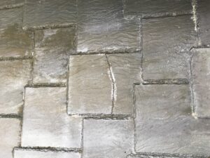 ひび割れ、塗膜剥離、苔の発生が見られます。