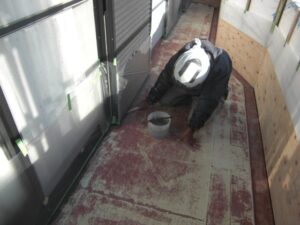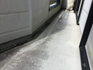 ベランダ床表面の塗膜が劣化しています。
