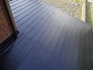 倉庫の屋根はスレート瓦です。塗膜の経年劣化により苔が発生しています。
