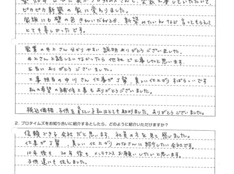 築20年古びた家がプロタイムズさんで塗装工事していただいてピカピカ新築の家に変わりました。家族にも壁の色きれいだねとか、新築みたいねなど言ってもらえてとても嬉しかったです。