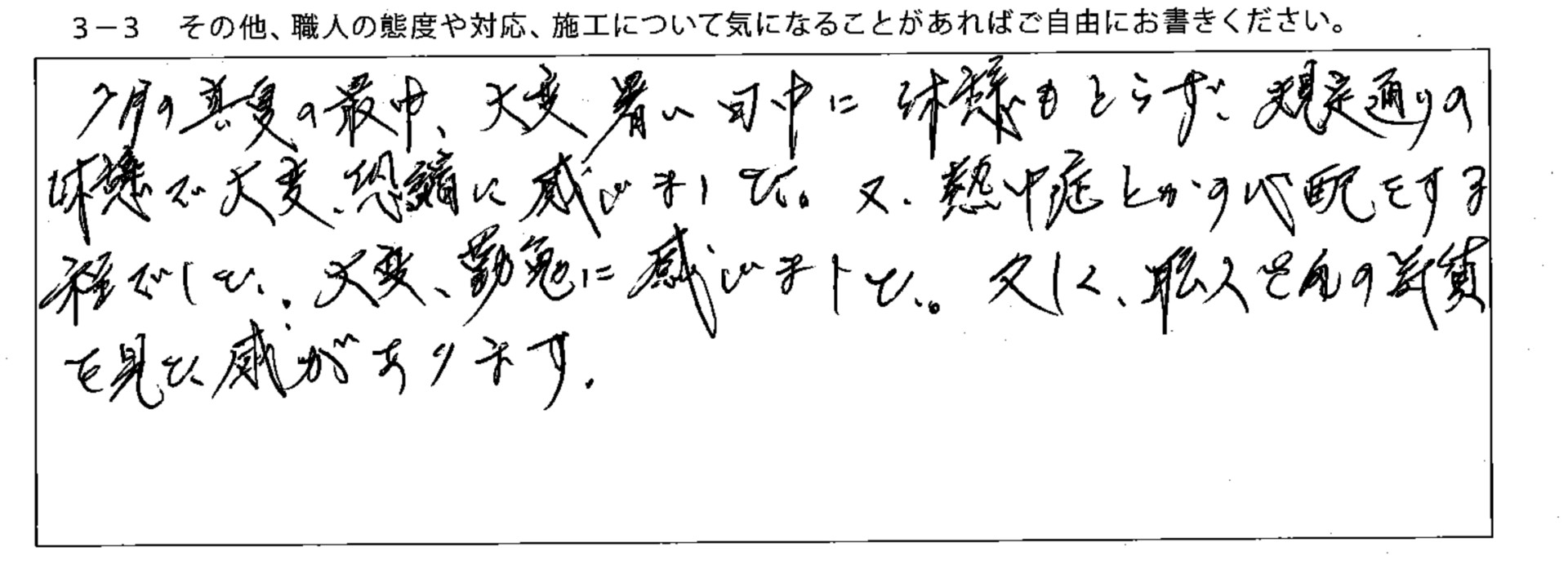 7月の真夏の最中、大変暑い日中に休憩も取らず規定通りの休憩で大変恐縮に感じました。又、熱中症とかの心配をする程でした。大変勤勉に感じました。久しく職人さんの気質を見た感が有ります。