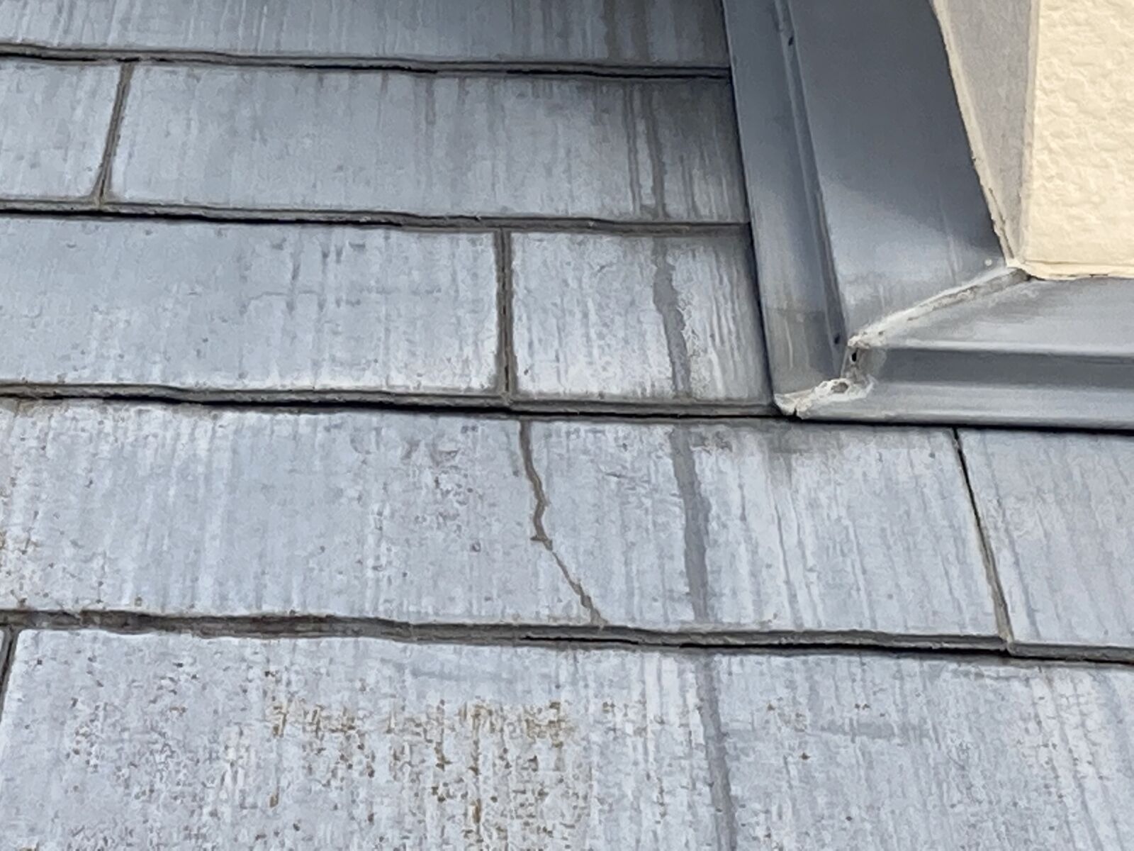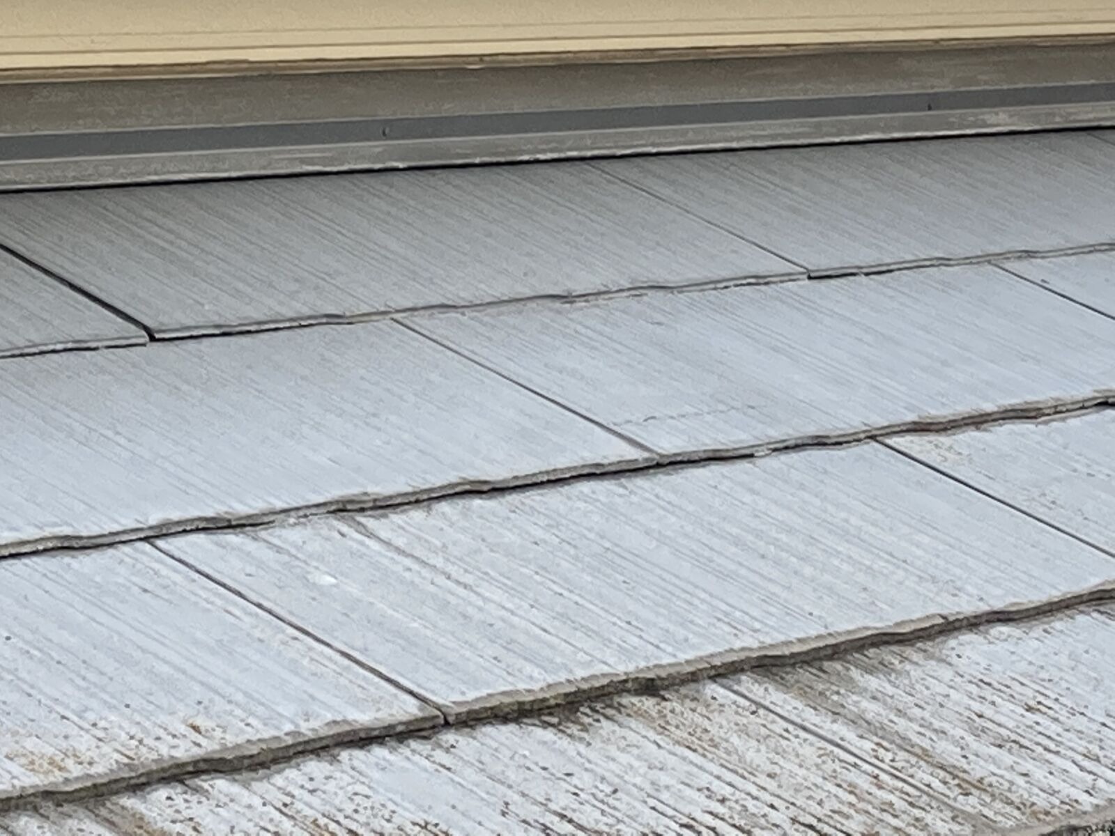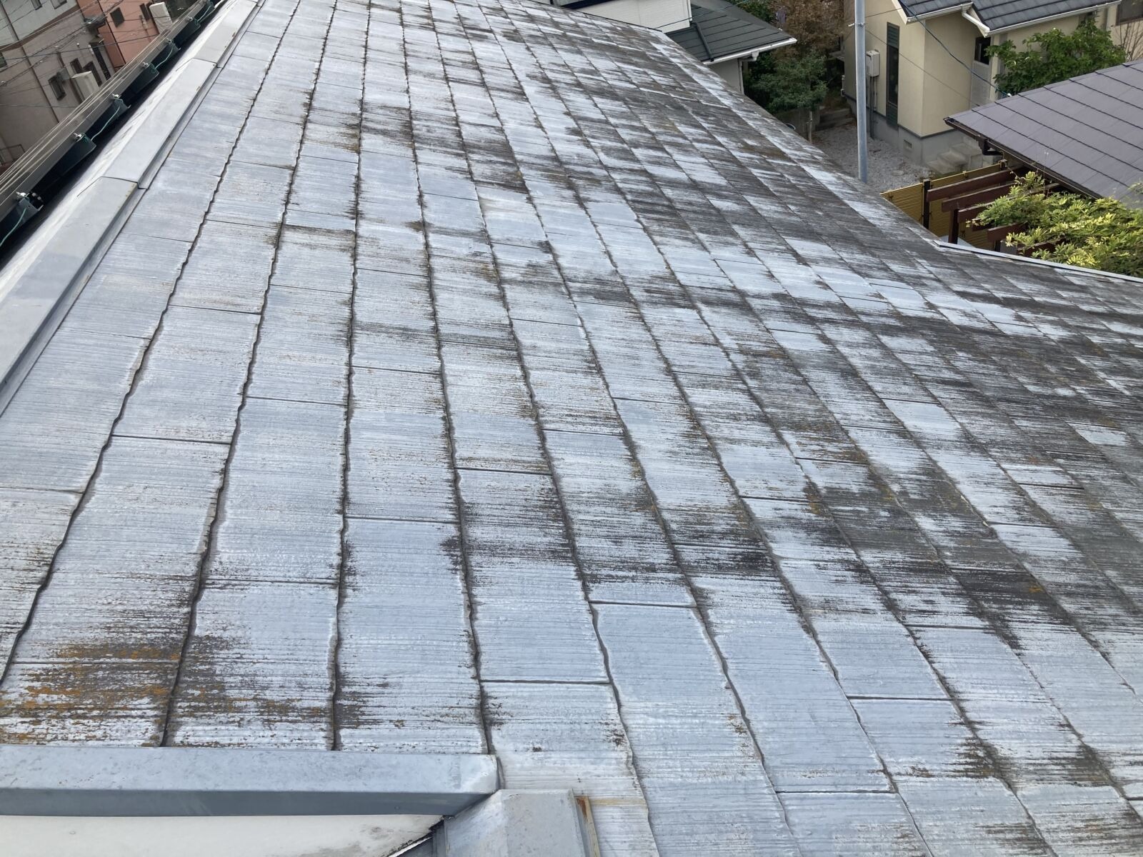 屋根材はスレート瓦です。塗膜劣化が見られます。