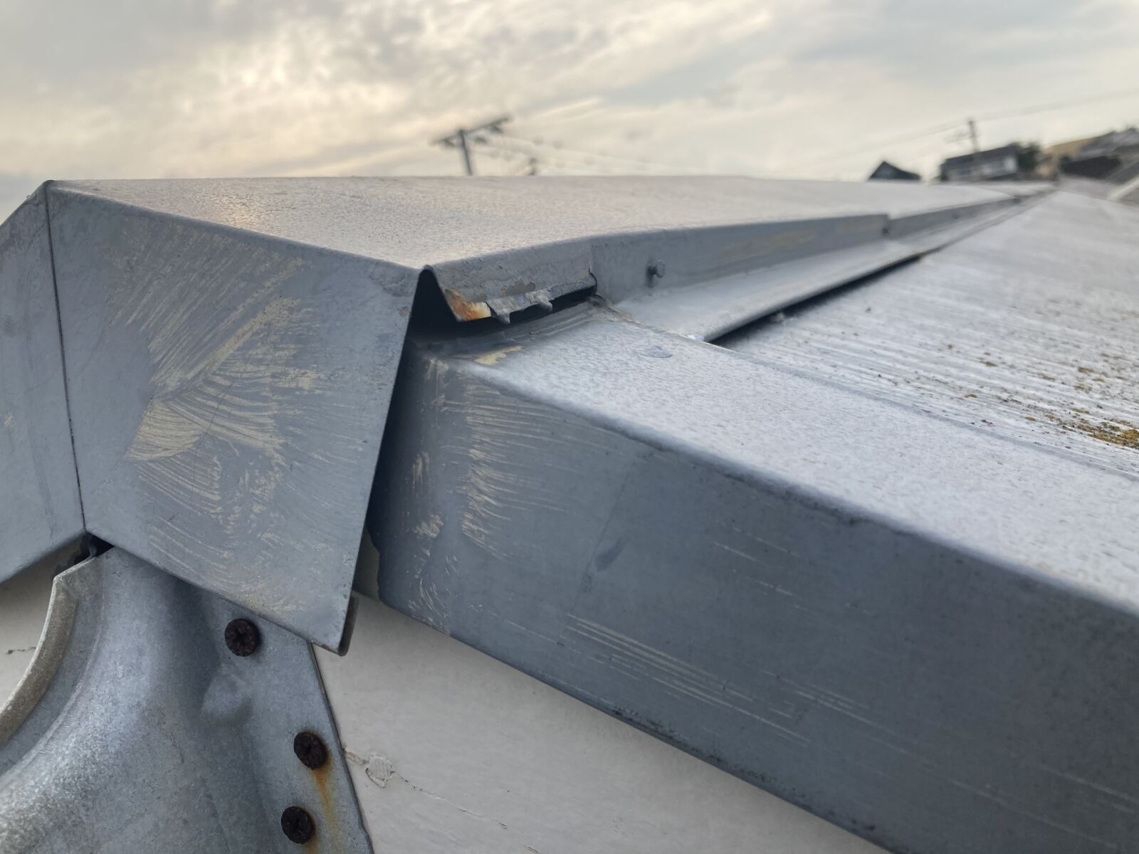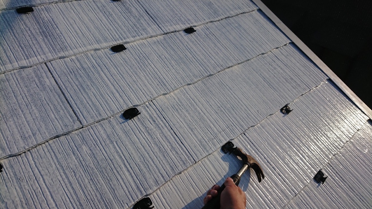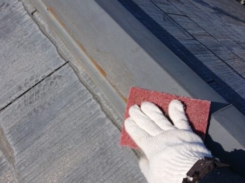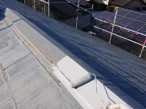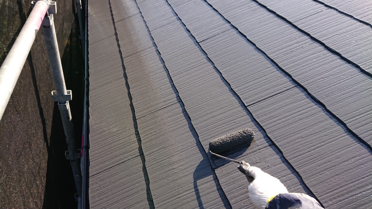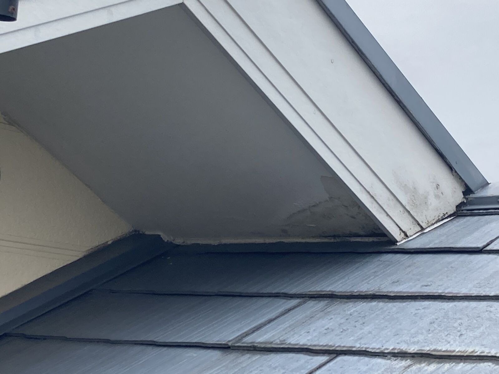 屋根材はスレート瓦です。塗膜劣化が見られます。