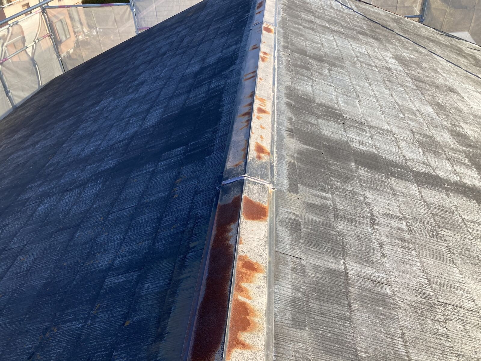 屋根材はスレート瓦です。棟板金が著しく劣化しています。