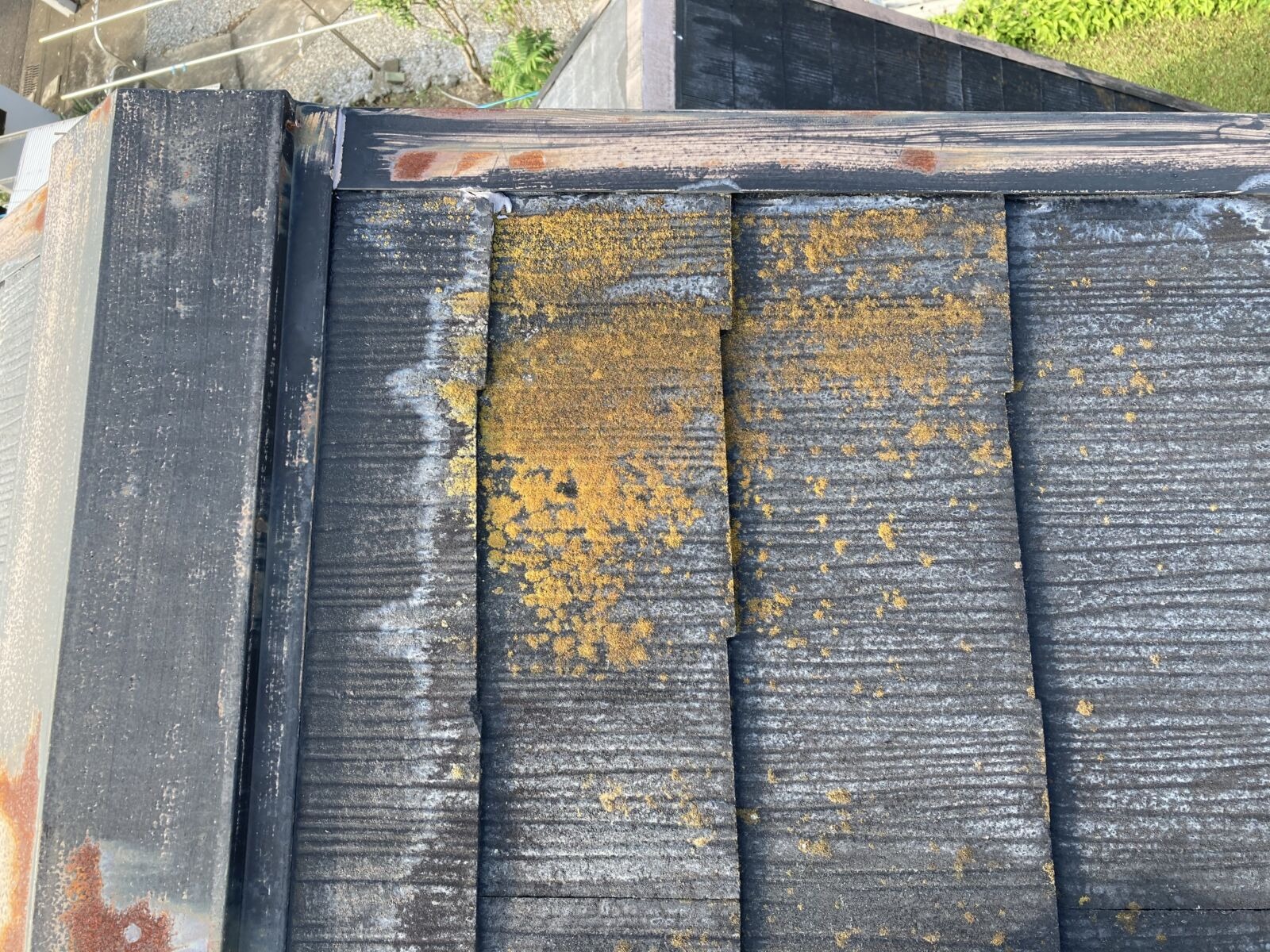 瓦に苔の発生が見られます。全体的な塗膜劣化も見られます。