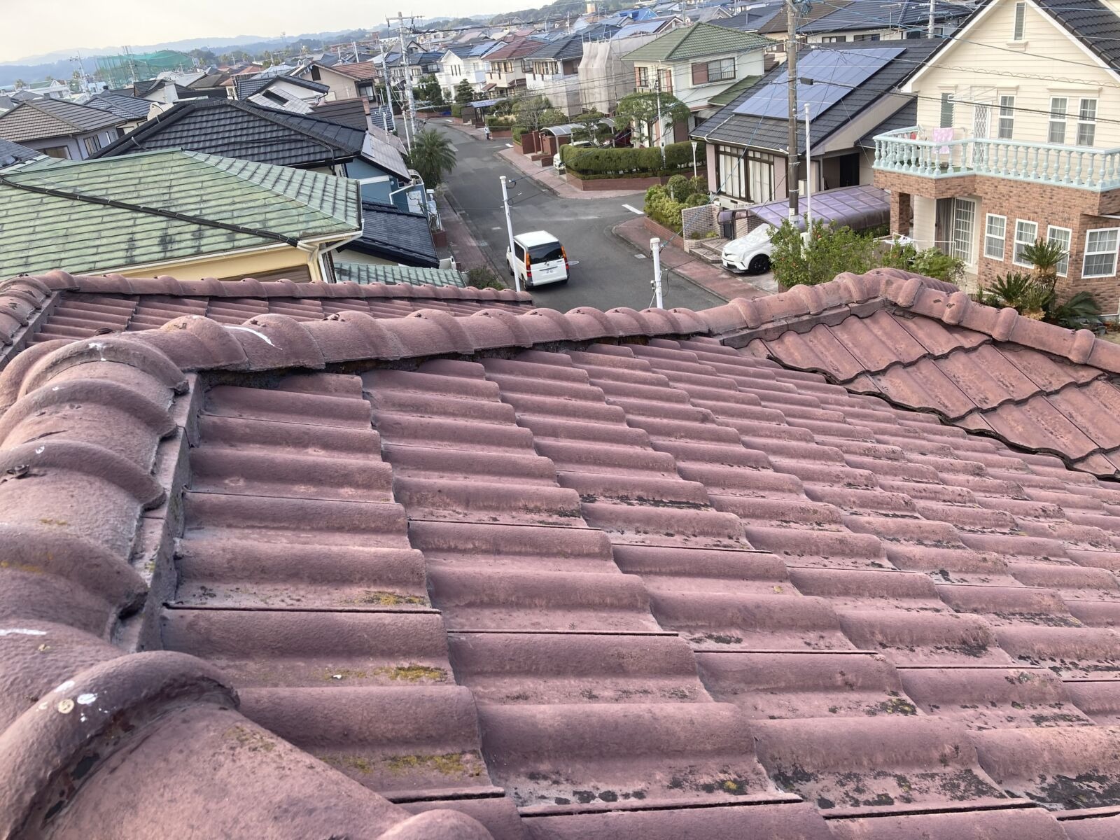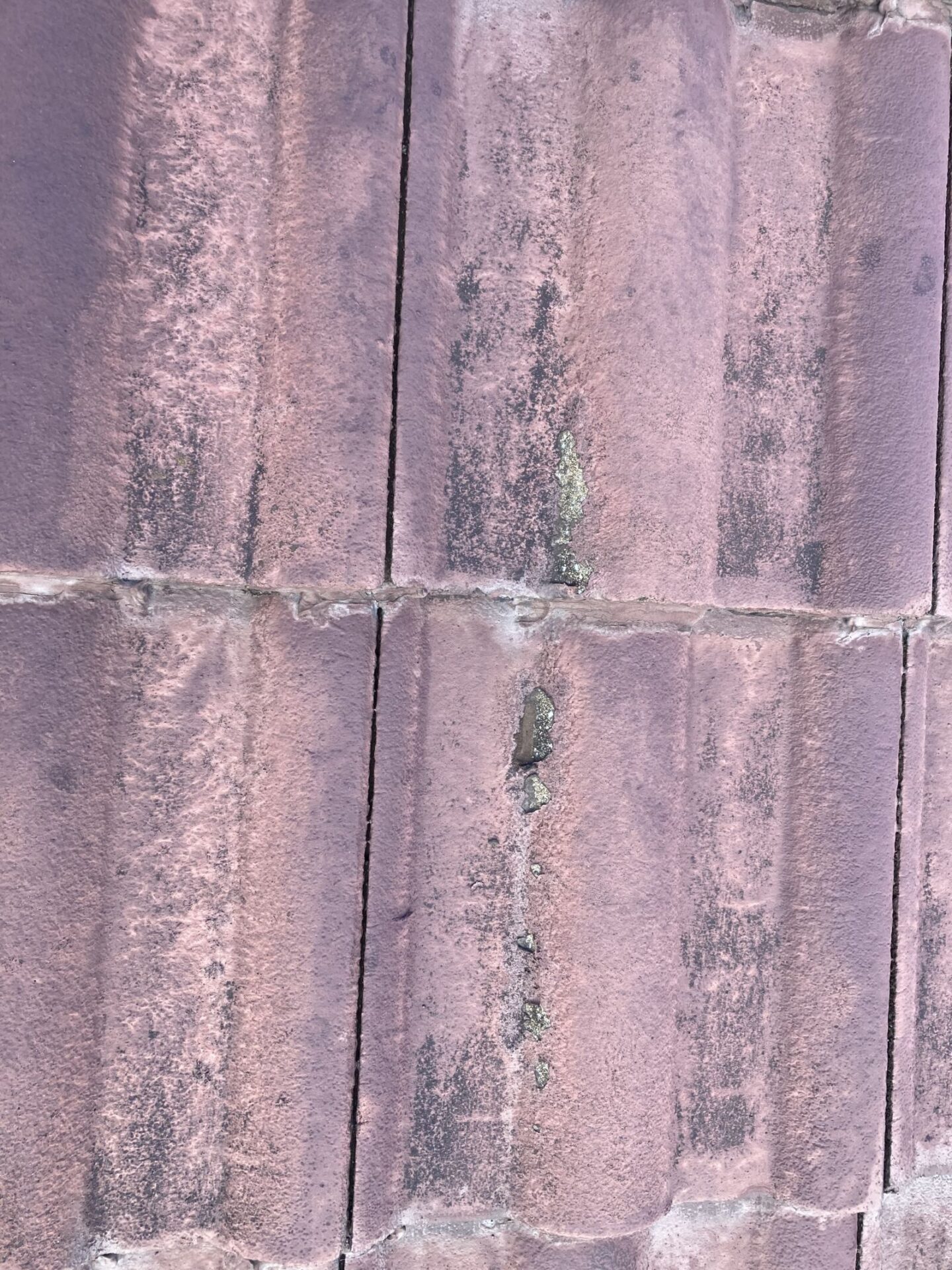 屋根材はモニエル瓦です。全体的に塗膜劣化が見られます。