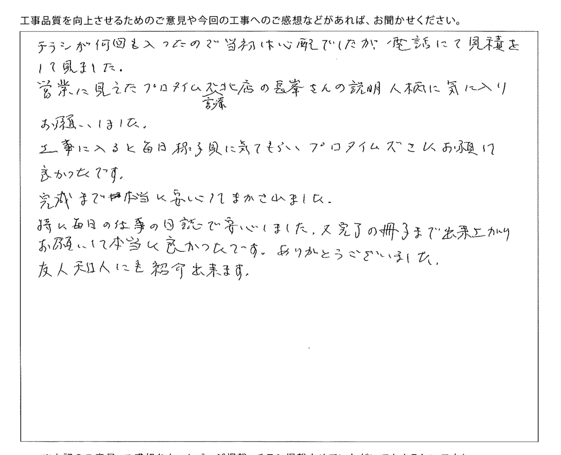 工事に入ると毎日様子見に来てもらいプロタイムズにお願いして良かったです。