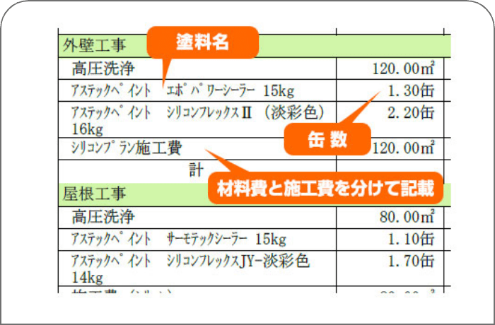 よくある塗装工事のお見積もりに「外壁塗装工事一式」という項目と塗装額だけが記載された、いわゆる”一式お見積もり”というものを提案してくる業者がいます。この一式お見積もりでは工事にどれくらいの材料費がかかっているのかなどの内訳がわからず、悪質な場合は不要な金額を上乗せされている可能性もあります。プロタイムズでは、見積もり書には材料費と施工費を分けて記載し、使用する塗料名と缶数も詳しく記載しています。細かい金額まで明確にすることで、何にどのくらいの費用がかかるのか、お客様にご納得いただけるよう工夫しています。
