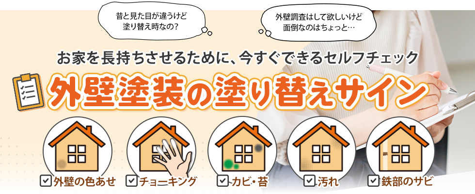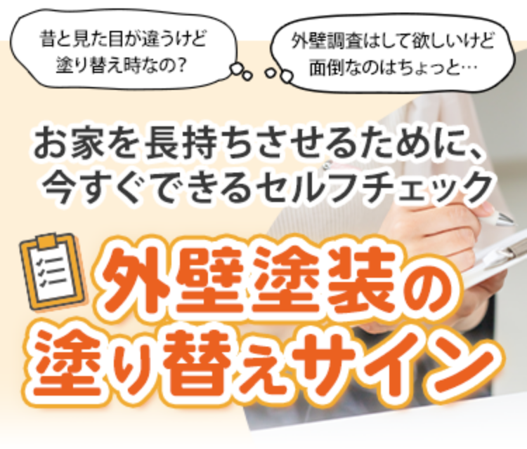 日本の住宅では防水性能などの点から一般的に「築10年で1回目の塗装」と言われています。防水性が切れてしまうと、住まいの構造体の劣化、雨漏りにつながる恐れも…。そうなる前にまずは自分のお家の外壁に「塗り替えサイン」が出ていないかチェックしましょう!
