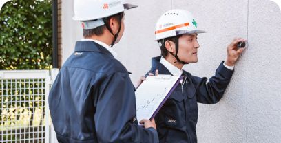 建物を細かくチェック - 診断は、塗装工事の品質を左右する重要な工程です。建物の状態を正確に診断するには、建物の構造や劣化のメカニズムなど、さまざまな専門知識が必要となります。そのため、「診断」には専門の資格を持ったプロが行います。