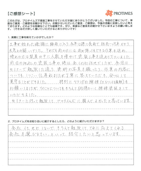 HOMEお客様の声 お客様の声 2018.08.01 宮崎市 郡司分『O様邸』 2018.07.27 宮崎市『U様邸』 2018.06.20 西都市『S様邸』 2018.06.04 宮崎市『I様邸』 2018.05.18 宮崎市 佐土原町『N様邸』 2018.03.25 宮崎市『S様』 < 1 2 3 ピックアップPICKUP リフォームローン 施工品質の裏付け 屋根カバー工法 外壁塗装の塗り替えサイン 火災保険でお得に修繕 住宅履歴情報管理システム 塗装品質へのこだわり 有資格者による建物診断 わかりやすく納得の見積もり 職人紹介 塗装の匠